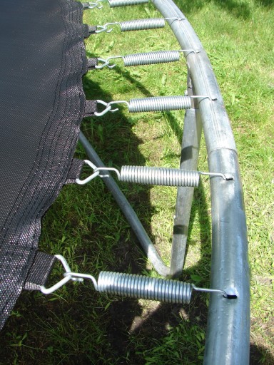 Рекомендую нові пружини для батутів різного діаметру, як на картинках нижче. Загальна довжина (з гачками) 116,4 мм. Діаметр загартованого і хромованого дроту 3 мм. Ці пружини дуже стійкі до розтягування і злому - 28 Н. Конічна структура, тобто витки зменшують діаметр на кінцях. Така конструкція пружин використовується в професійних батутах.