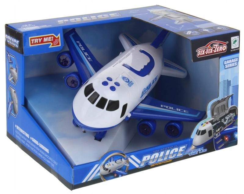 Interaktywny samolot z napędem frykcyjnym spodoba się każdemu małemu pilotowi, który w przyszłości pragnie zostać policjantem. Samolot wyposażony jest w cztery przyciski, które aktywują efekty dźwiękowe i świetlne. Wewnątrz samolotu znajduję się luk bagażowy do transportu dwóch pojazdów ratowniczych. Otwierana klapa od ładowni pozwala na załadunek pojazdów na pokład samolotu.