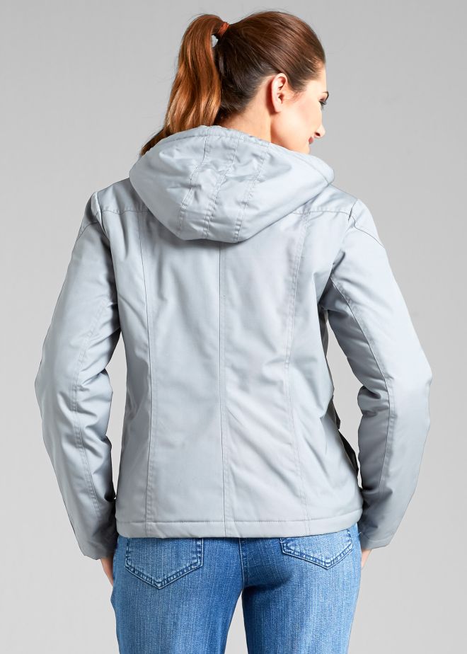 Modna ocieplana kurtka z mocnego materiału bawełnianego z nieodpinanym kapturem. Z przodu na dole dwie duże kieszenie, oraz dwie na klatce piersiowej- wszystkie zapinane na patki z napami. Zapinana na dwukierunkowy metalowy zamek błyskawiczny. Podszewka w kolorze pasującym do materiału wierzchniego. Na kurtkę naszyto ozdobne naszywki.