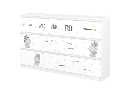 Комод виготовлений з білої витяжної дошки, оздоблений шпоном. Він складається з шести висувних ящиків, встановлених на напрямних і оснащених упорами, які запобігають їх повне висування. Фронталі ящиків мають принти в яскравих кольорах, додатково захищені спеціальним ламінатом для запобігання вицвітанню та стиранню. Ви можете без жодних побоювань мити їх ганчіркою або рідиною.