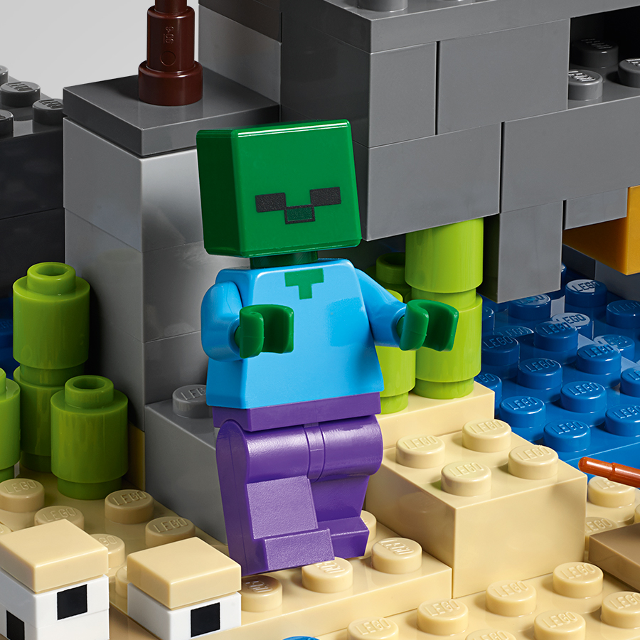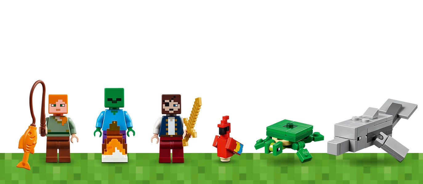 - W zestawie dwie minifigurki: pirat i Alex, a także zombie z gry Minecraft oraz figurki delfina, papugi i żółwia (nowości na styczeń 2019 r.).