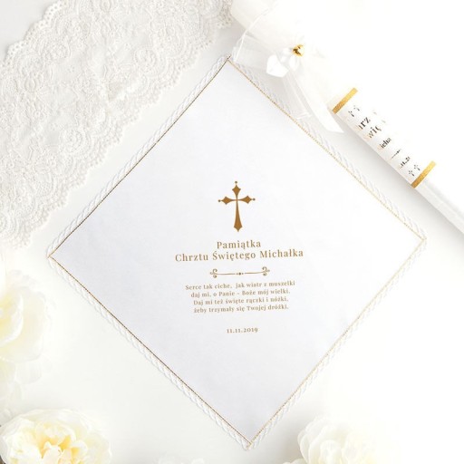 Хустка для хрещення, прикрашена золотим хрестиком і золотою окантовкою. Елегантний сувенір на пам'ять про хрещення, прикрашений відбитком імені дитини та дати церемонії. Це гарний подарунок як для хлопчика, так і для дівчинки.