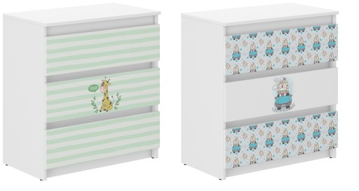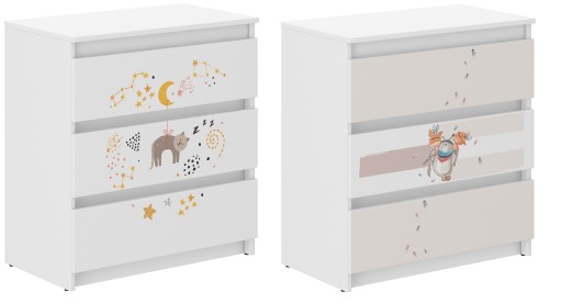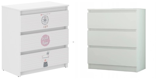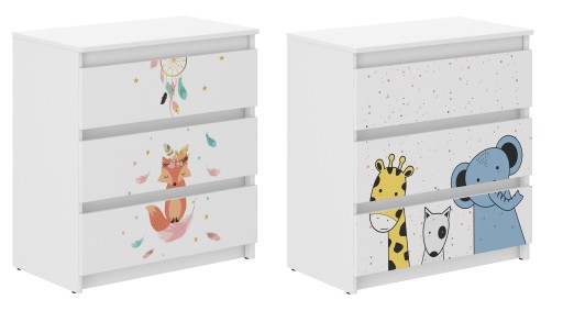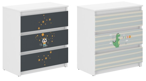 Сучасний комод R-3 - практичний і функціональний предмет меблів, який знайде своє місце в будь-якій дитячій кімнаті. Ергономічні розміри забезпечують комфортне облаштування кімнати. Комод виготовлений з ДСП білого кольору, оздоблений шпоном. Складається з трьох висувних ящиків, встановлених на напрямних, які оснащені упорами для запобігання повного висування. Дверцята комода мають барвистий принт у яскравих кольорах і захищені спеціальним ламінатом для запобігання вицвітанню та стиранню. Ви можете мити його тканиною та рідиною без будь-яких турбот.