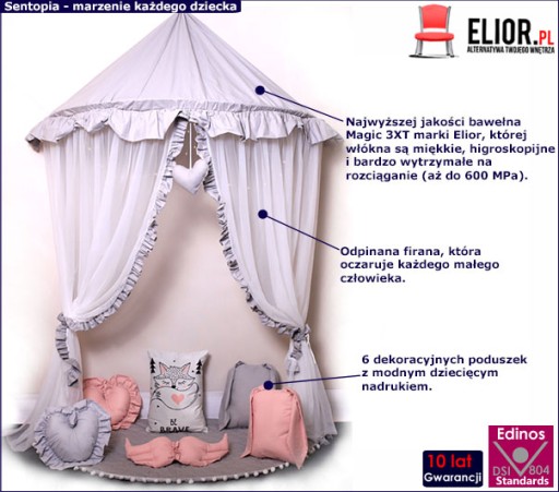 Перш ніж перейти до практичного використання нашого намету, познайомимося з продуктом «зсередини». Спочатку зупинимося на матеріалах. Виробник торгової марки Elior піклується про якість своїх меблів, тому ми виготовили навіс Sentopia 4X з бавовни Elior Magic 3XT найвищої якості. Бавовна - натуральна тканина, яка не викликає алергічних реакцій, забезпечує повітропроникність, приємна на дотик і дуже міцна. Це ідеальний матеріал для кожного малюка. Дах з бавовни ми поєднали з ніжною шторкою, яку прикрасили чарівним воланом. Все це створює феноменальний дизайн, який порадує кожну маленьку людину. Ми доповнили набір килимком з оксамитового стьобаного матеріалу River 7XT фірми Elior. Тканина легка, стійка до пошкоджень і неймовірно ніжна. Ваша дитина буде в захваті.