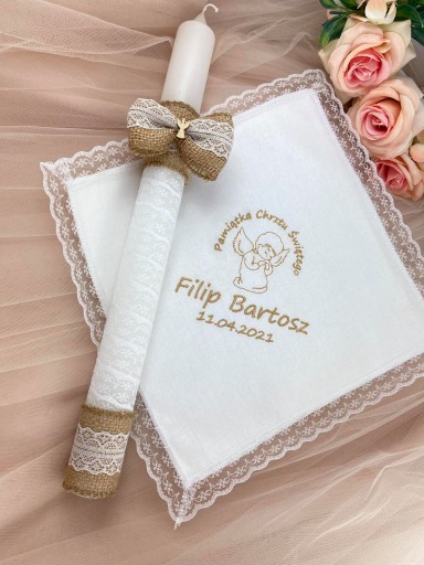 - свічказ високоякісного воску, довжиною 43 см, у формі витонченого конуса. Прикрашенийджут,мереживоі зі смакомдерев'яний ангел.