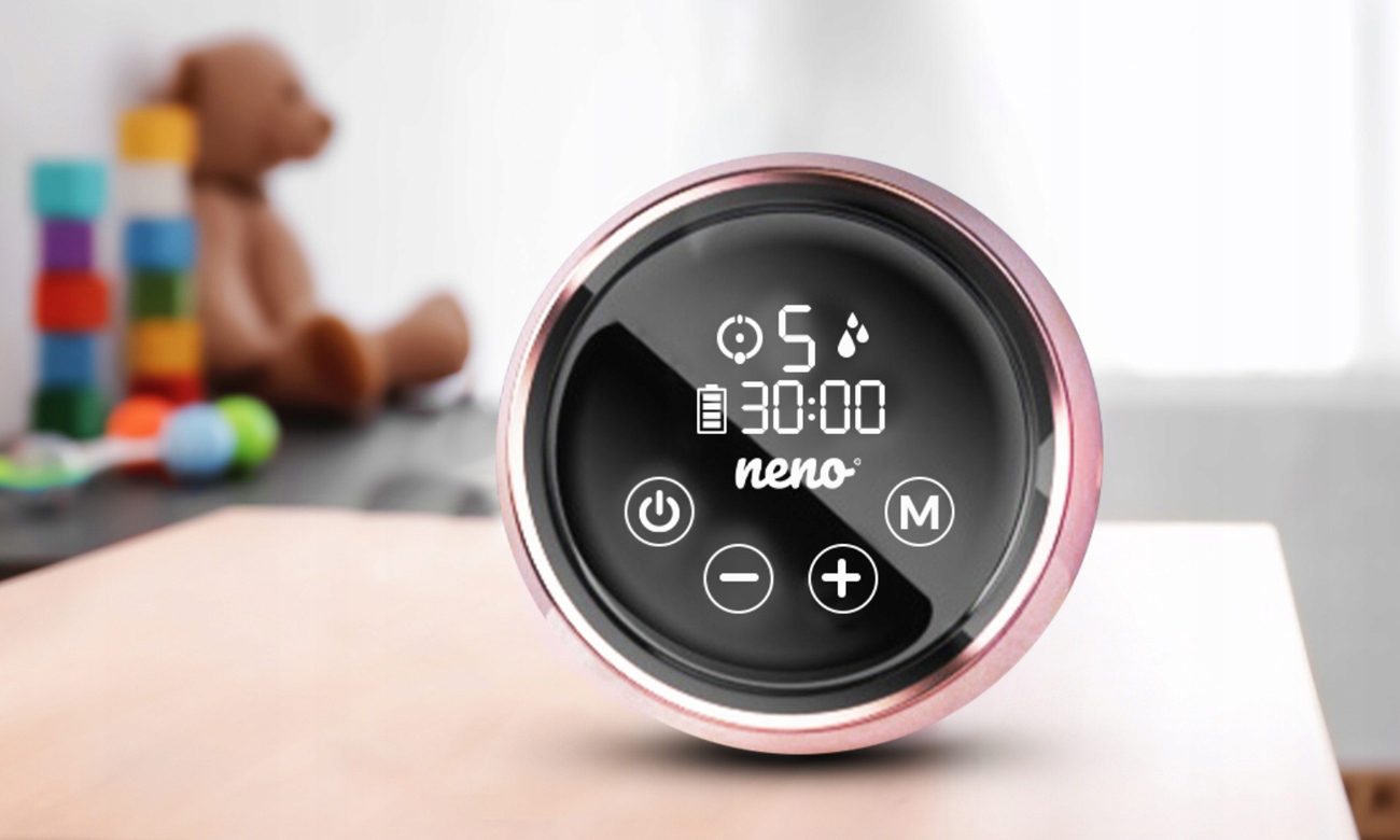 Wyświetlacz laktatora Neno Bella jest przejrzysty i czytelny, pokazuje włączony tryb, wybrany stopień siły odsysania, pozostały czas pracy urządzenia i stan baterii. Obsługa urządzenia jest łatwa i przyjemna dzięki czterem dużym przyciskom umieszczonym na panelu dotykowym. Dodatkowo laktator zapamiętuje ostatnie ustawienia.