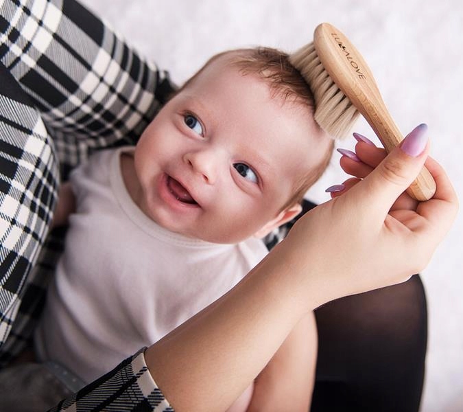 Małych rozmiarów szczotka z naturalnym włosiem o bardzo miękkim włosiu dostosowanym do delikatnej i wrażliwej skóry niemowląt.