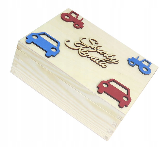 Oferujemy drewniane pudełko - szkatułkę - z ozdobnymi kolorowymi samochodami i traktorami oraz napisem Skarby Kamila..