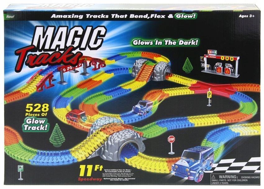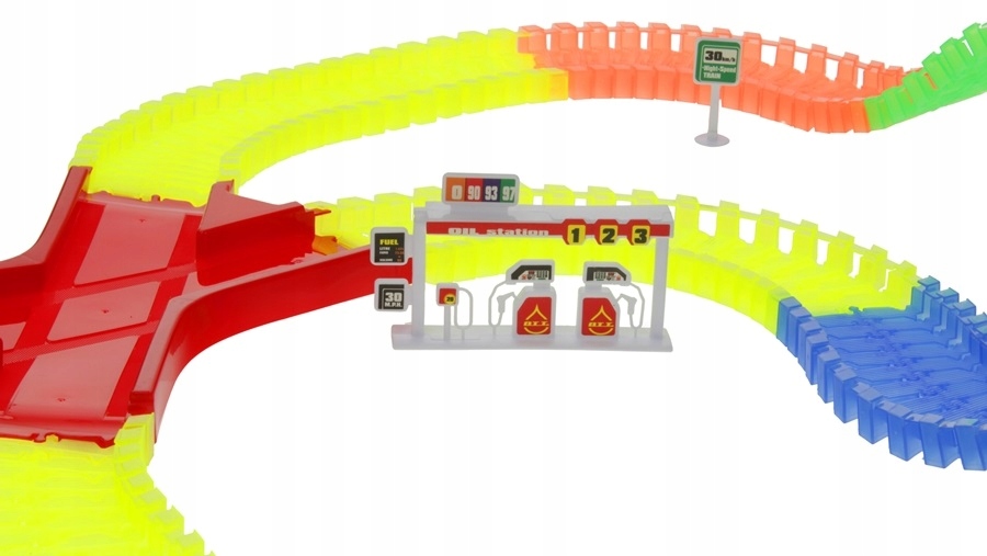 Tor samochodowy zapewni dziecku wiele godzin świetnej zabawy. Elementy toru, dzięki swojej dużej elastyczności można przekładać, obracać, podnosić, zmieniać kierunek jazdy i układać w dowolne kombinacje. Każdy element toru jest wypinany wiec łatwo się go składa i rozkłada. W ciemności, pod wpływem świateł poruszającego się autka, tor wygląda jakby świecił. Dziecko podczas zabawy może rozwijać zdolności manualne, konstrukcyjne oraz kreatywność.
