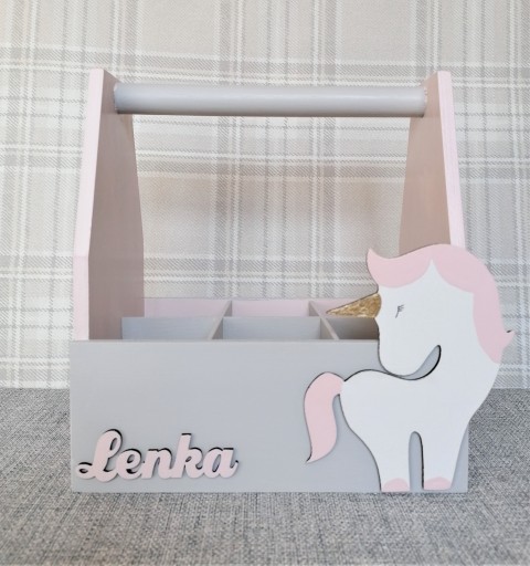 Представлена коробка для інструментів пофарбована в рожево-сірий колір, а її додатковою прикрасою є декор у формі ЄДИНОРОГА, виготовлений нашими майстрами.