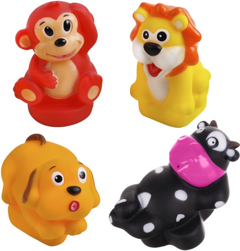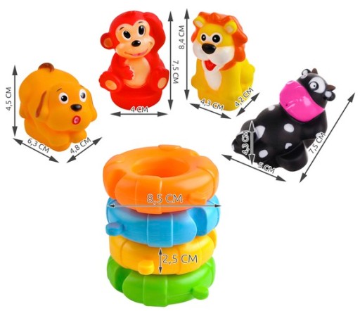 - РІЗНОМАНІТНІСТЬ ФОРМ, КОЛЬОРІВ ТА МАТЕРІАЛІВ - банний гарнітур складається з 8 елементів, які характеризуються різною формою, кольором і типом матеріалу; У набір входить 4 пластикових пазла і 4 м'яких гумових тварини у вигляді лева, мавпи, собаки і корови.