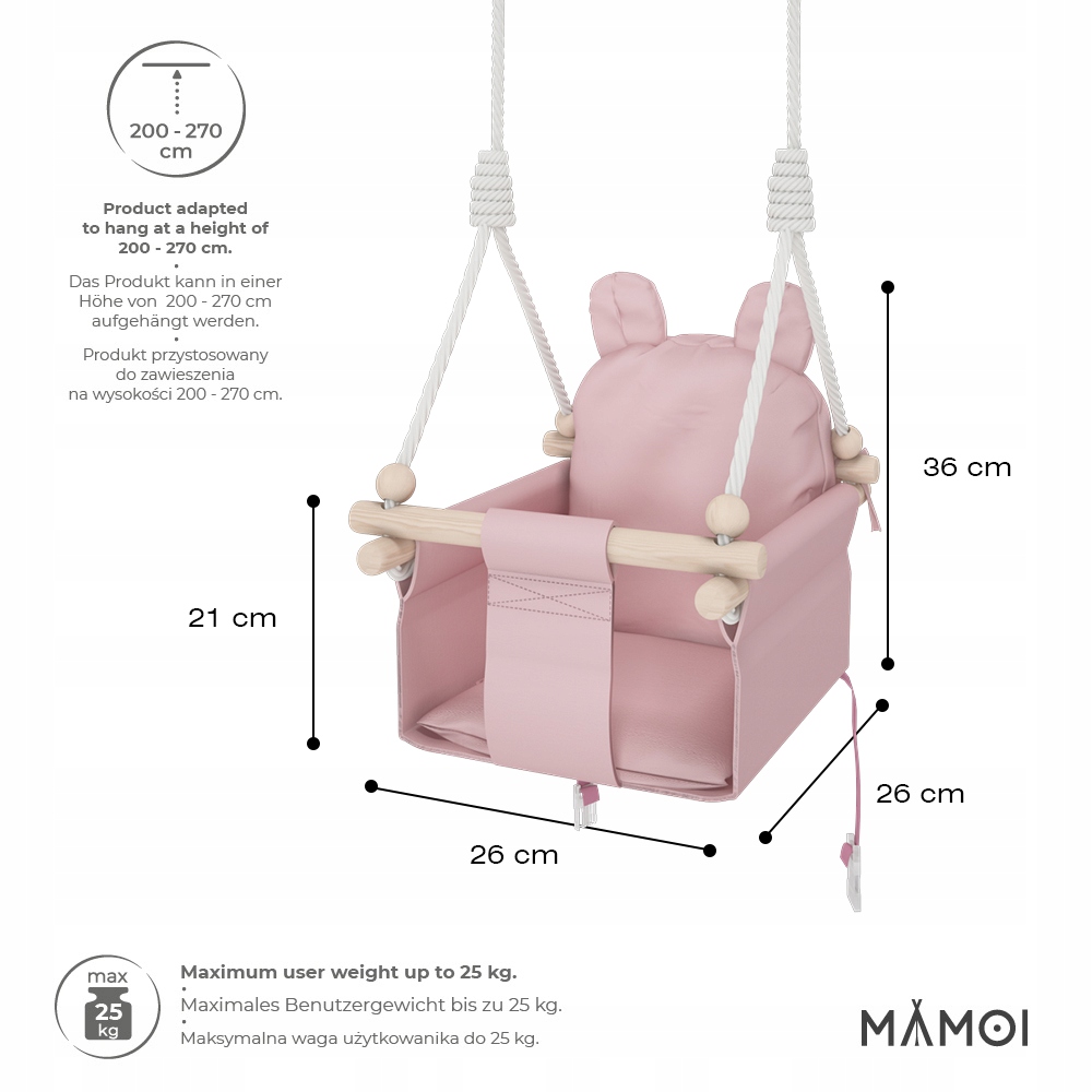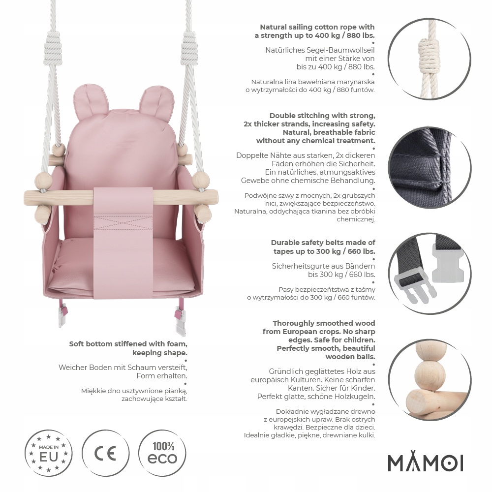 - Brak stosowania materiałów toksycznych, chemicznych czy alergenów. Skandynawska huśtawka MAMOI™ jest całkowicie bezpieczna dla malucha.