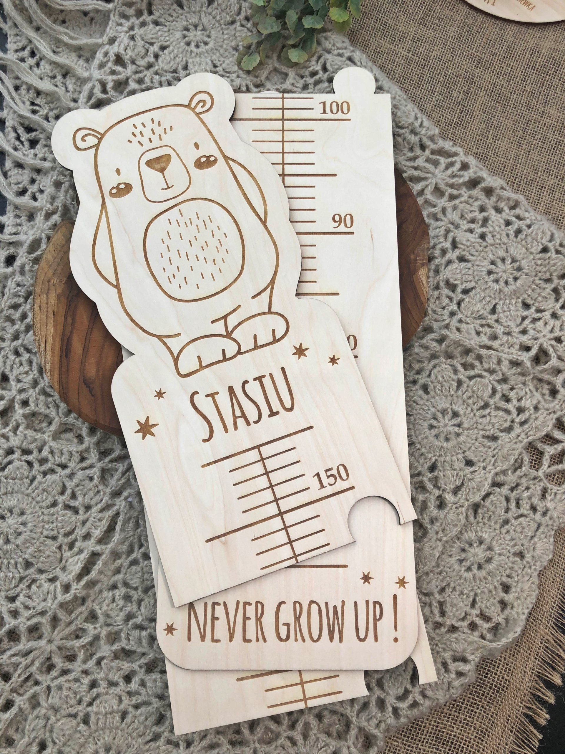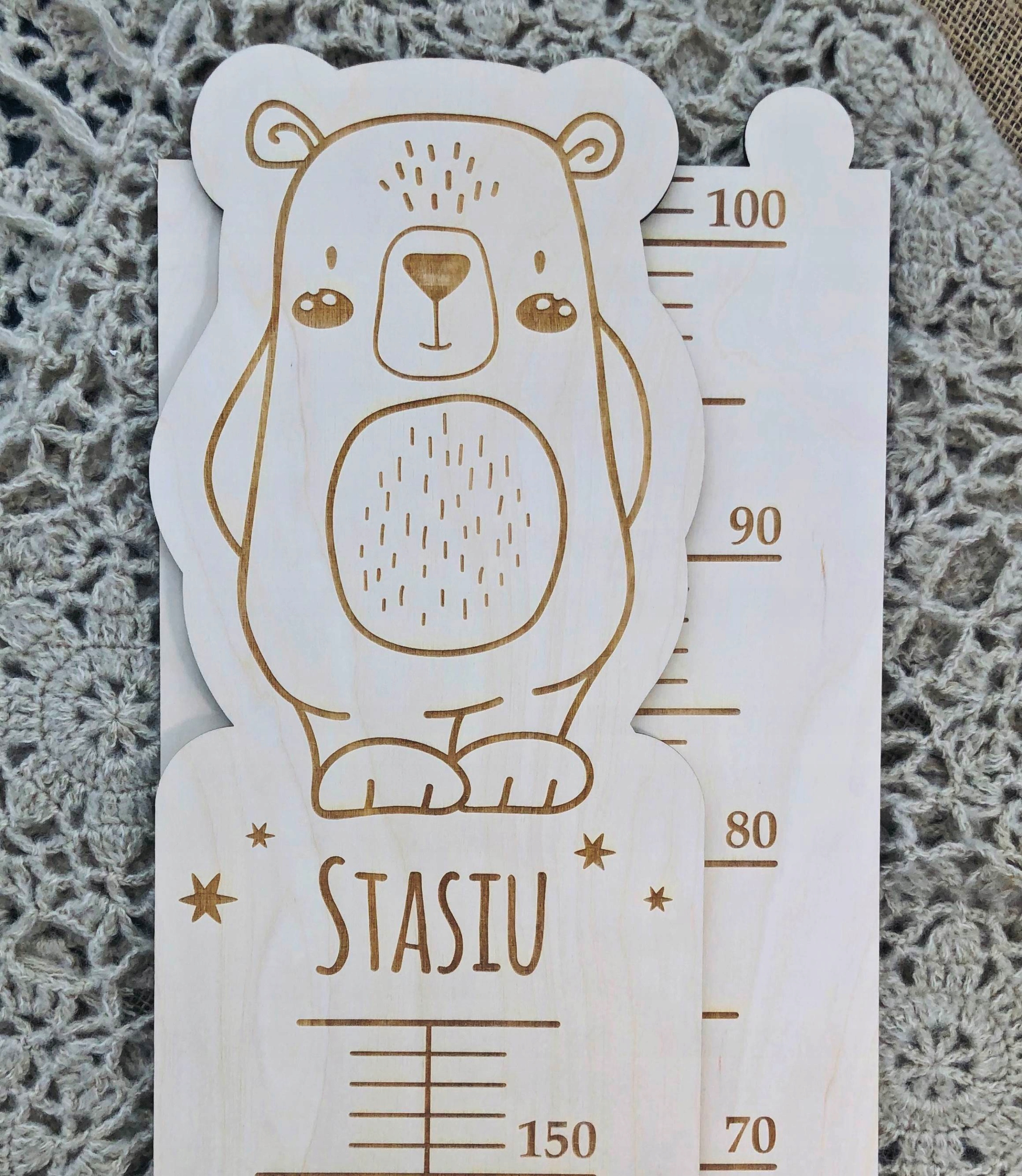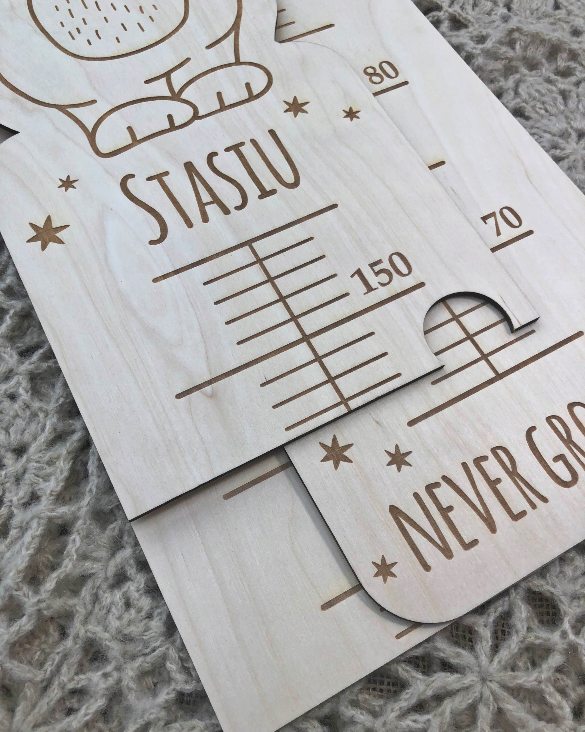 Drewniana miarka cięta laserowo. Składa się z 3 części. Puzzlowe połączenie ułatwia montaż na ścianie. Zalecane montowanie na dwustronną, taśmę piankową (nie dołączamy do zestawu).