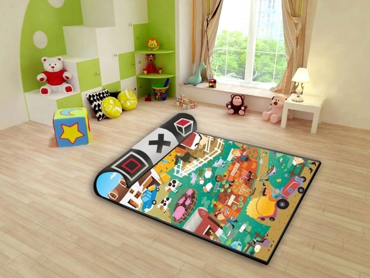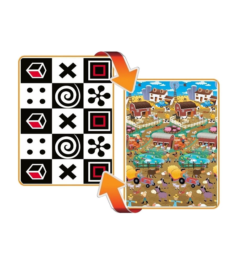 Mata jest wykonana z tworzywa EPE wysokiej jakości. Jest dwustronna - po jednej stronie jest obrazek z farmą, a z drugiej strony obrazek z geometrycznymi kształtami. Mata może z powodzeniem zastąpić dywan i stanowić ciekawy element dekoracyjny dziecięcego pokoju.