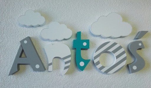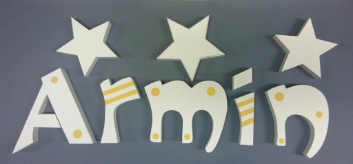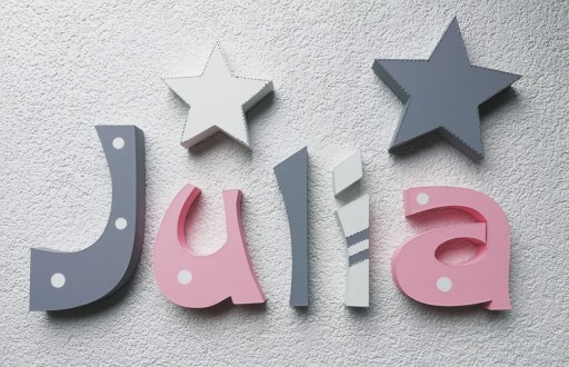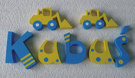 Барвисті літери виготовлені зі світлого стиродуру товщиною близько 3 см. Висота найбільшої літери приблизно 17 см, решта букв пропорційні малюнку. Літери вручну розписані акриловими фарбами та прикрашені різноманітними мотивами, що дає чудовий кінцевий ефект. Вони чудово підійдуть як оригінальна та ефектна прикраса будь-якого інтер'єру, а також ідеальний подарунок дітям та батькам.