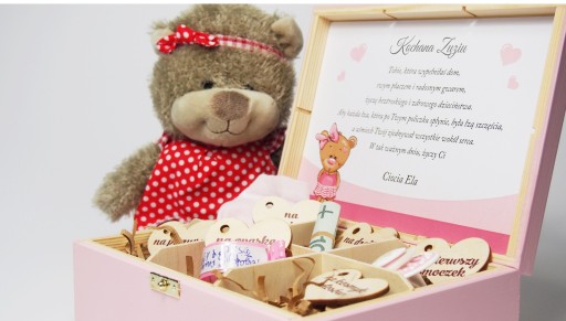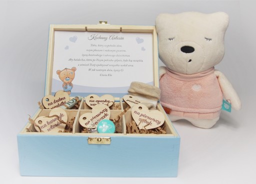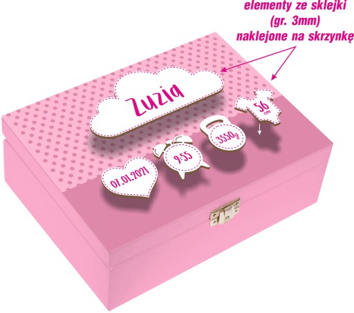 Коробка має розміри 22 х 16 х 8 см. Лицьова сторона має склеєні фанерні елементи, на яких зображено ім'я дитини на хмарі, дата народження на сердечку, час народження на годиннику, вага дитини на слінгу та зріст дитини на боді.