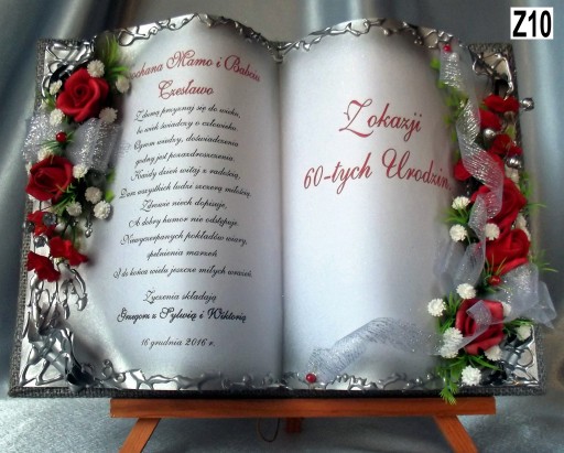 у вигляді пам’ятної книжки, яку ми виготовляємо повністю вручну в техніці просторового оформлення колажу – художні вироби ручної роботи, красиво упаковані, на головній сторінці якої розміщуємо персоналізований текст з побажаннями ДНЯ НАРОДЖЕННЯ, ім’ям іменинника, дата, а можливо і місце, і в підписі хто складає побажання. Прикрашаємо все це красивою об'ємною композицією з тканинних квітів.