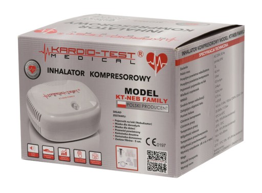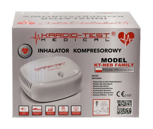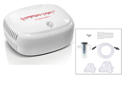Компресорний інгалятор КАРДІО-ТЕСТ КТ-НЕБ ФЕМІЛІ — це медичний виріб, призначений для інгаляційної терапії дихальних шляхів, що полягає в застосуванні інгаляційних препаратів, призначених лікарем, наприклад, Будесонід, Пульмікорт, Фліксотид, Беродуал, Міфлонід. Спільна робота небулайзера і повітряного компресора створює аерозольний туман, призначений для інгаляції дихальних шляхів пацієнта і, як наслідок, лікування респіраторних захворювань. Апарат оснащений двома масками різного розміру, що дозволяє ефективно використовувати обладнання як дітям, так і дорослим. Інгалятор легкий і простий у використанні, а всі його компоненти зручно зберігати в футлярі, що входить в комплект.