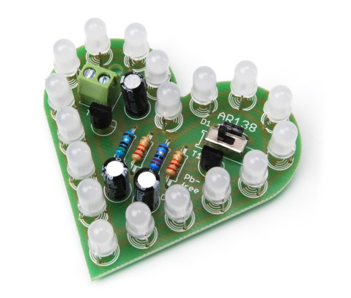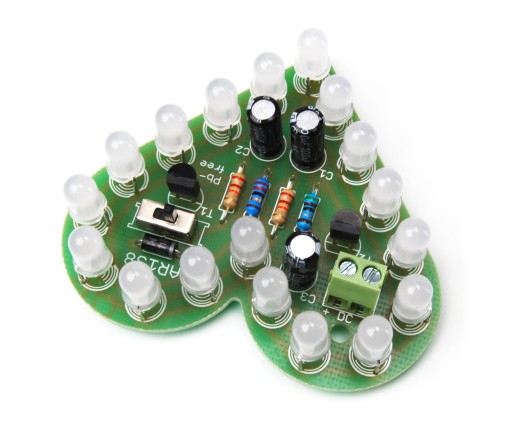 Плата має форму серця, а система має 18 великих двоколірних світлодіодів. У серці також є вимикач живлення.