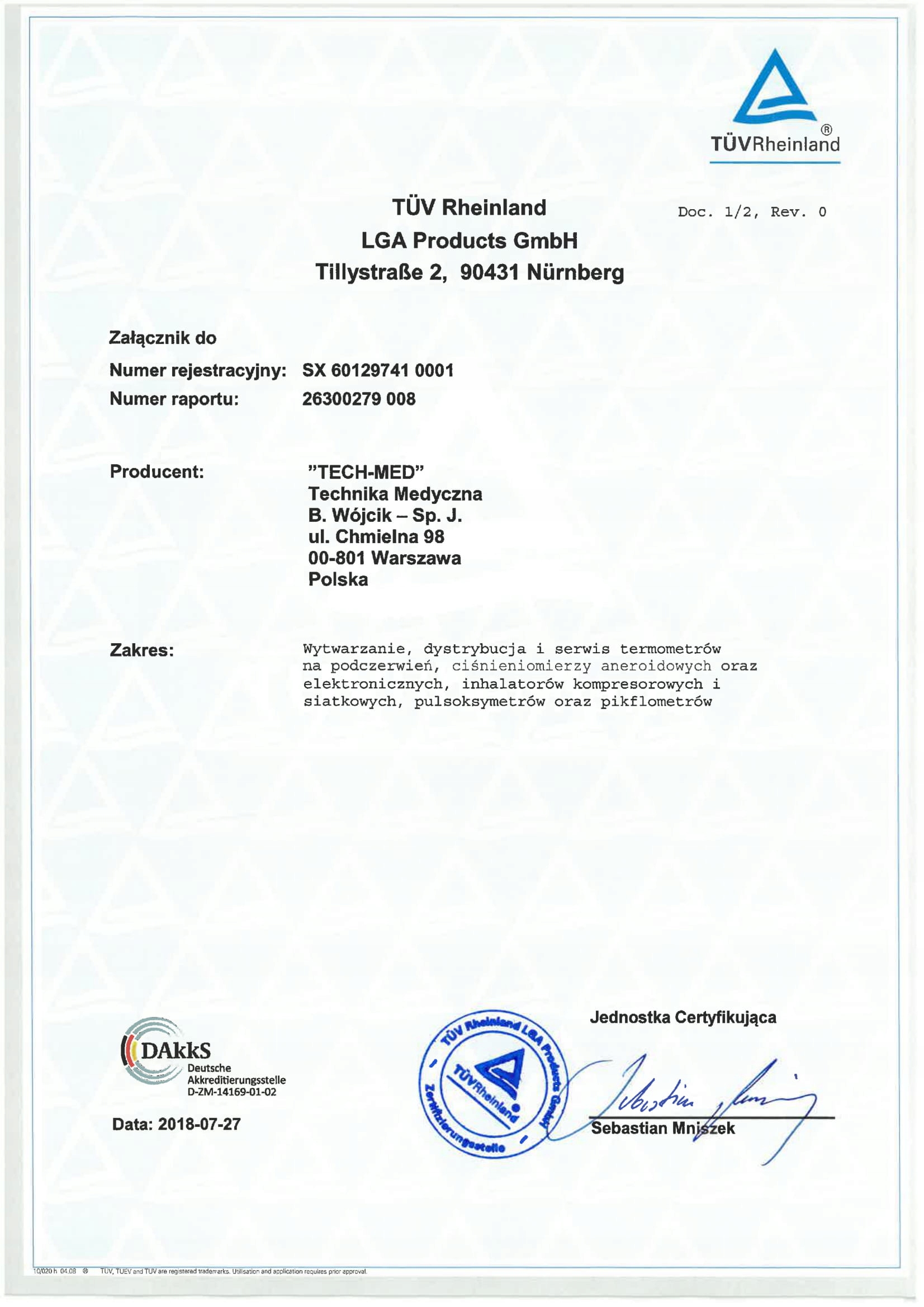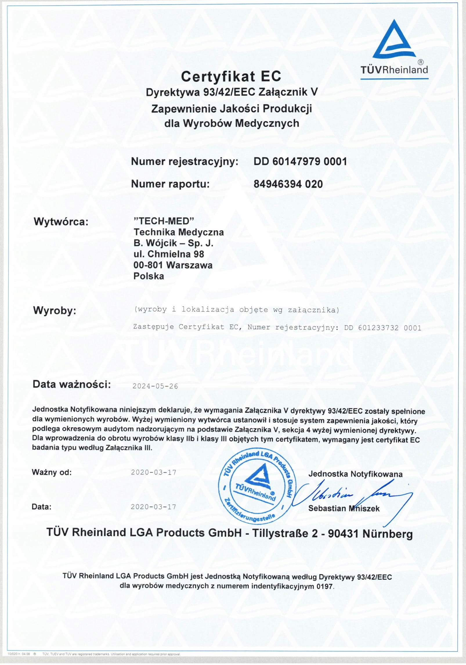 System zarządzania jakością w naszej firmie ISO13485 został potwierdzony i jest nadzorowany przez jednostkę certyfikującą TÜV Rheinland.