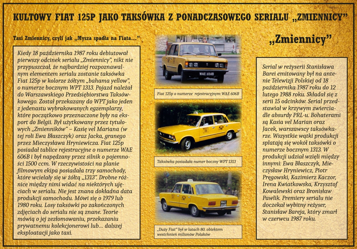 Słynna żółta taksówka o numerze bocznym WPT 1313 i numerze rejestracyjnym WAE 606B z serialu "Zmiennicy" w reżyserii Stanisława Barei. Idealnie odwzorowany model w estetycznym, kartonowym opakowaniu typu window box, świetnie prezentującym się na półce każdego miłośnika modeli samochodów.