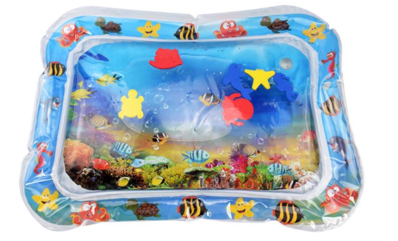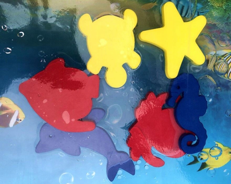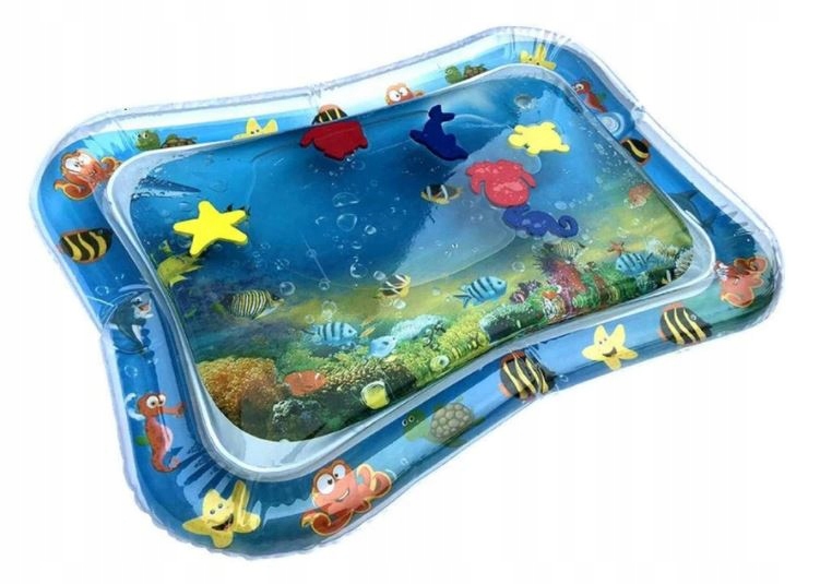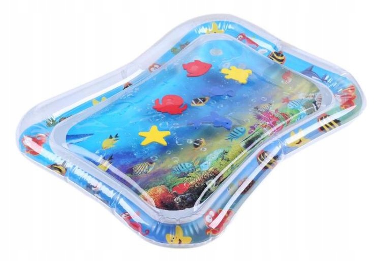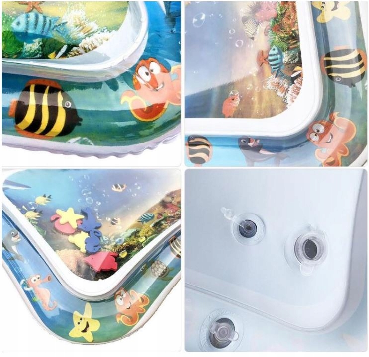 Wewnątrz maty zostały umieszczone kolorowe zwierzątka wodne, które będą przesuwać się pod wpływem ruchów dziecka.