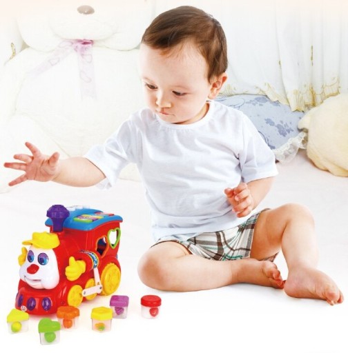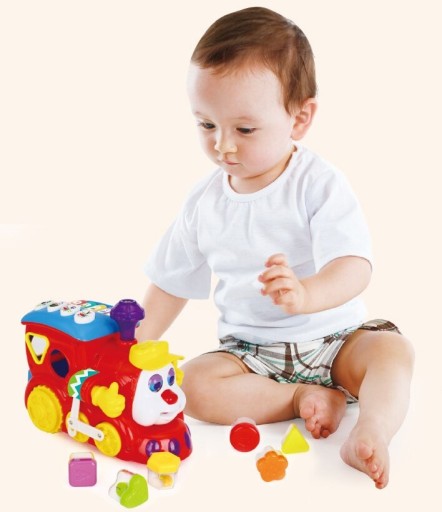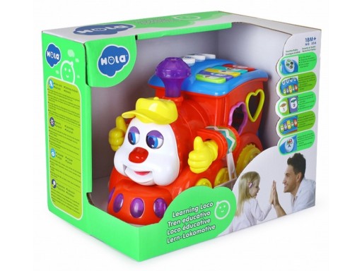 На даху паровозика — різнокольорові кнопки та піаніно. Це серія різних звуків, мелодій, звуків тварин і поїздів тощо. Боки поїзда створюють сортер, завдяки якому дитина вправляється в ручних навичках і вивчає форми та кольори, розміщуючи блоки в правильних отворах. Також у локомотива є багажник, відкривши який ми отримуємо доступ до вставлених раніше блоків. Блоки неодмінно привернуть увагу кожної дитини - кожен різного кольору, різної форми та з різними фруктами всередині. Крім того, кожен блок має окрему букву: A, B, C або цифру: 1, 2 або 3.