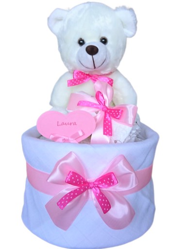 На цьому аукціоні ми пропонуємоторт з підгузків, подарунок з підгузків. Для цього м'якого,плюшевий Теддіі білийтетра підгузник.