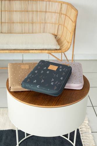 Всередині, з обох сторін, є кишені, які дозволяють зручно організувати важливі документи, як для батьків, так і для дитини, з одного боку є 7 менших відділень, наприклад, для карток або візиток, і одне більше, наприклад, для щеплення. буклет або картку про вагітність, з іншого 3 трохи більших, наприклад, для нотаток або підтвердження страхування, і один з віконцем, ідеально підходить для фото. У центрі є складка з місцем для ручки. Вміщує аркуші паперу формату А5.